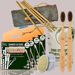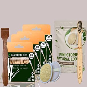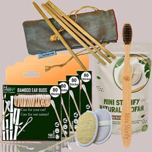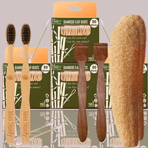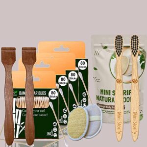 4 Bamboo Cotton Ear Buds 80 Wood Stems/160 Swabs|1 Adult bamboo toothbrush|2 Oval Loofah Sponge Body scrubber|4 Bamboo Straw(8 inch)