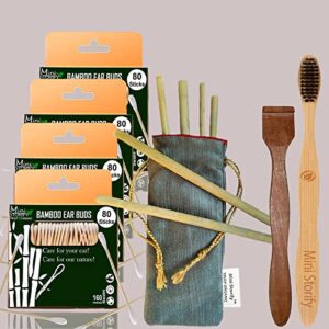 4 Bamboo Cotton Ear Buds 80 Wood Stems/160 Swabs|1 Adult Bamboo toothbrush |1 Neem Tongue Scraper for Adults & Kids|6 Bamboo Straw(8 inch)