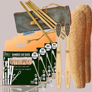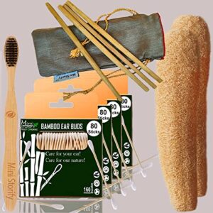 4 Bamboo Cotton ear buds/swabs|80 Stems|1 Adult bamboo tooth brush|2 Loufah/loofah Pads, Sponge Body scrubber|4 Bamboo Straw8″)
