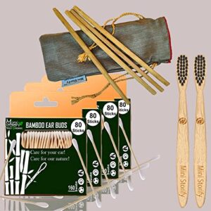 4 Bamboo Cotton Ear Buds/swabs|80 Stems/160 Swabs|2 Adult Bamboo Tooth BrushCharcoal Soft Bristles,Natural,Oral Cleaning|4 Bamboo Straw8″)