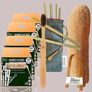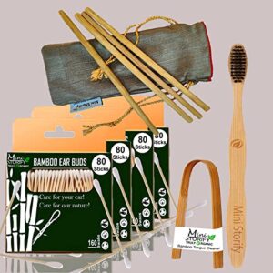 4 Bamboo Cotton Ear Buds/swabs|80 Stems|1 Adult Bamboo Tooth BrushCharcoal Soft Bristles,Oral Cleaning|1 Bamboo Tongue Cleaner|4 Straw8″)