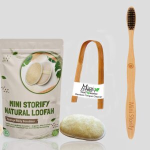 Adults Bamboo Toothbrush, Tongue Cleaner and Oval Loofah Body Scrubber Combo Pack Soft Bristles, Bathing (Set of 3)